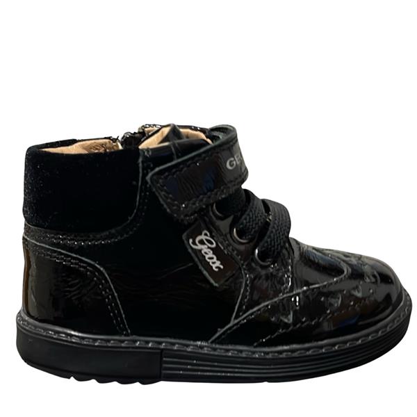 Dress your little girl in style and comfort with the Geox Girls Velcro Lace Ankle Boot in Black. These boots blend practicality with a fashionable design, ideal for both casual and more formal occasions.