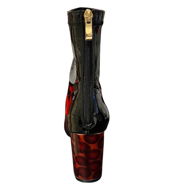 Featuring a unique back zip design, slipping on and off these boots is a breeze, making them an ideal choice for busy lifestyles. The standout heel, painted with a vibrant orange background and accented with a striking red ball, adds a playful touch to any outfit. With their square toe design, these boots offer not only style but also comfort, providing ample room for your toes while maintaining an elegant silhouette.